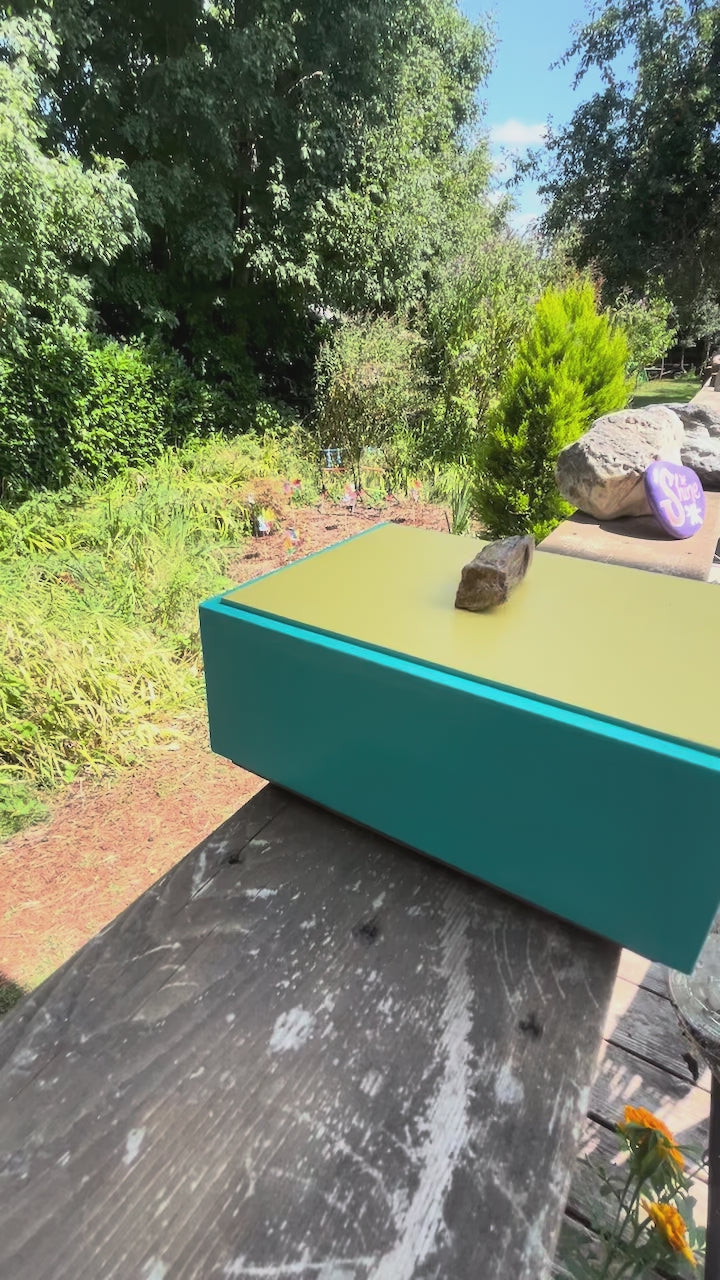 Features: • Solid Oak bottom for strength and durability • Reversible lid with traditional Alderwood handle or petrified wood pull • Hand-painted patina milk paint finish with smooth sanding • Bright yellow underside of lid for a pop of color • Dimensions: 7” L x 5.5” W x 4” H